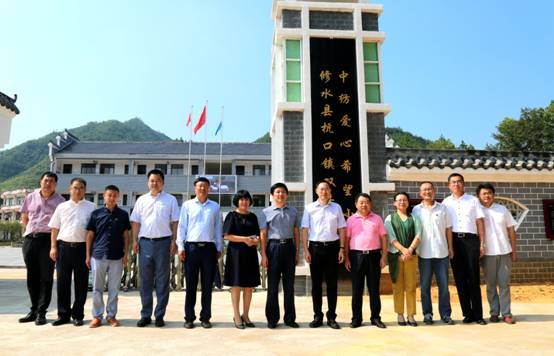 中粮集团党组副书记、总裁于旭波(左八)在中国纺织党委副书记、总经理袁飞(左六)陪同下考察由中国纺织援建的双井小学